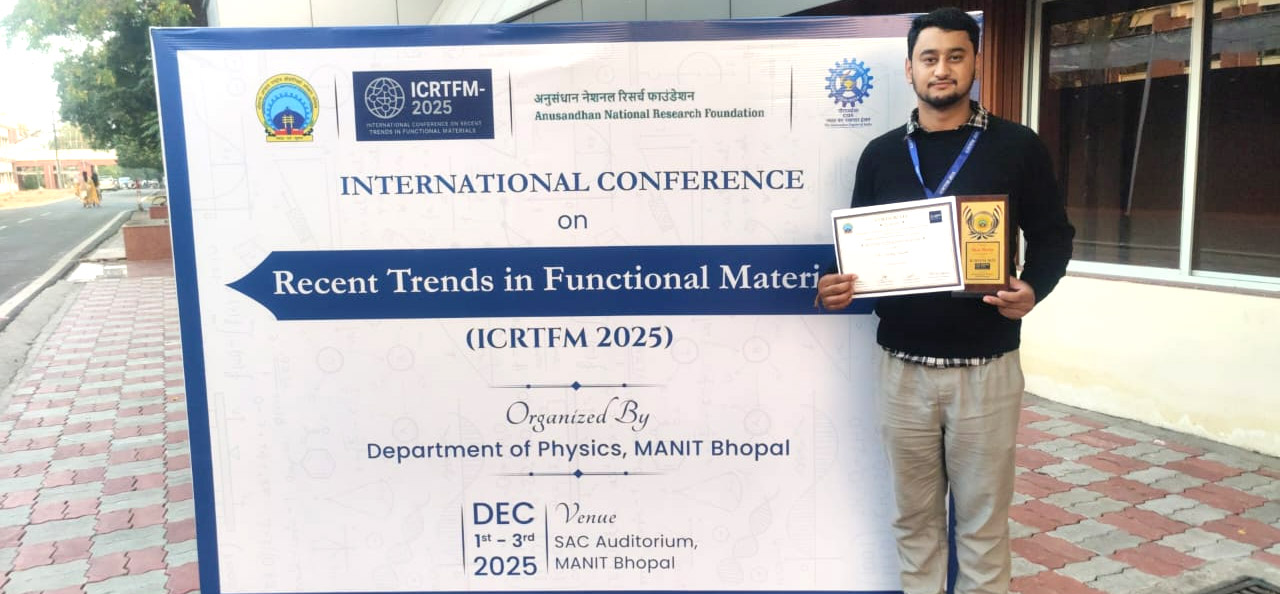 Mr. Vinay Rawat, Research Scholar, Department of Physics, has received the Best Poster Presentation Award at the International Conference on Recent Trends in Functional Materials (ICRTFM-2025), held December 1-3, 2025, at MANIT Bhopal, M.P., India, for his poster entitled “Biosynthesis of Ternary Nanocomposites (rGO-TiO₂-Fe₂O₃) for Supercapacitor Electrodes.” The research work was carried out under the guidance of Dr. Pankaj Chamoli, Dean, SBAS."